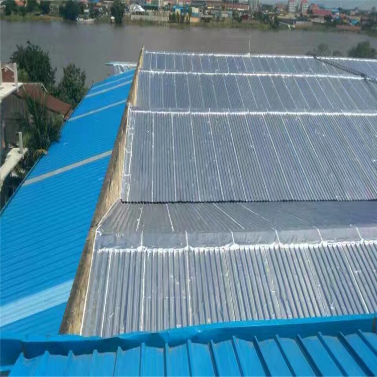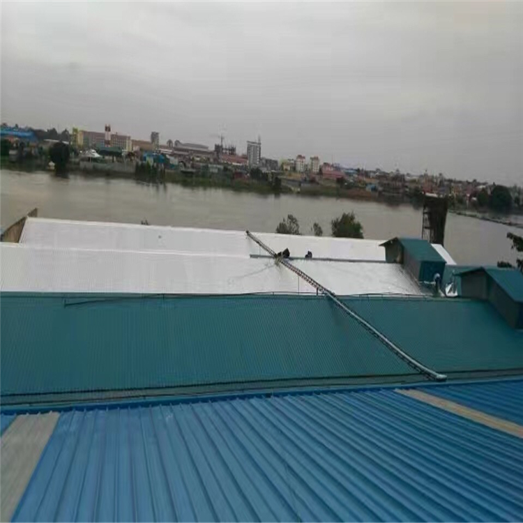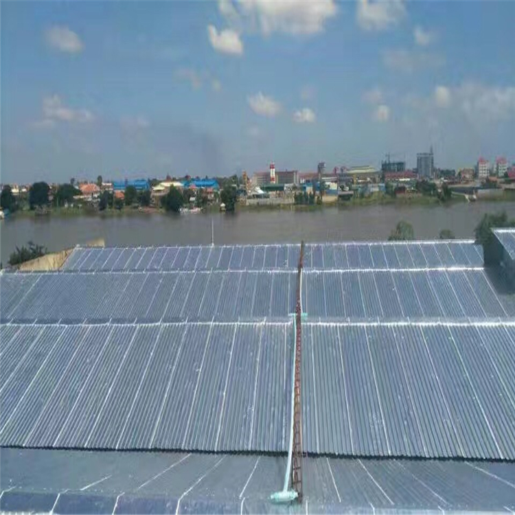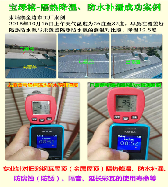 柬埔寨金边市文具厂金属屋面隔热防水工程案例厂房腐蚀生锈老化、铁皮表面破洞~雨天漏水,钉眼、接缝处防水沥青胶脱落~雨天漏水严重,给车间作业带来极大的生产影响。屋面全面覆盖上~宝绿榕防晒隔热防水补漏毯,不紧解决了屋顶漏水问题,也解决了传统铁皮厂房隔热降温效果。 夏天厂房室内温度直降5至10度。 铁皮表面最高温直降20度以上。