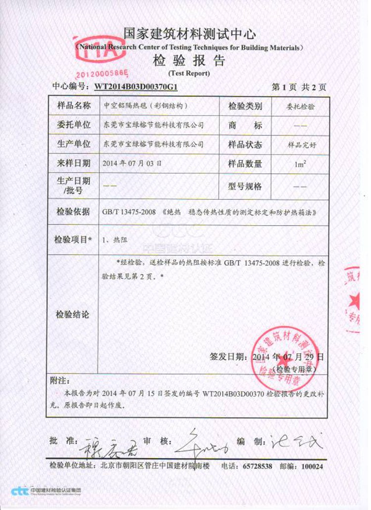 (气泡铝隔热毯)热阻系数检测报告